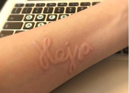 有趣的是,皮肤书写艺术在21世纪初因阿莉安娜·佩奇而出名。她还在身上画各种图案,然后拍下过敏反应的照片。