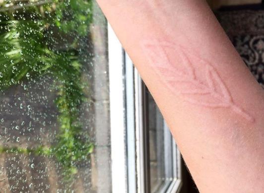 艾玛用铅笔在身上画了各种各样的符号,并在社交网络上分享了她皮肤书写症发作的结果。