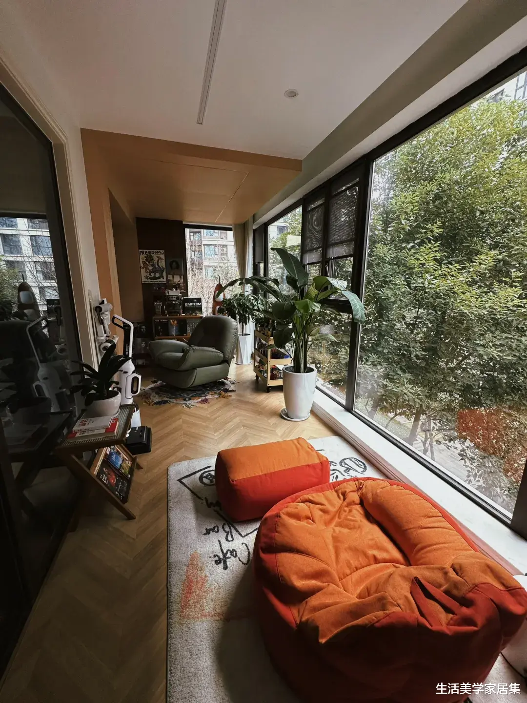 特别值得一提的是他家的超大阳台。由于居住在4楼,这个贯穿式的大阳台被周围的绿树巧妙地遮挡,无需担心与对面楼的居民产生对视的尴尬。阳台宽敞而舒适,深度达到了7米,宽度也有2米。屋主将其打造成了一个阅读区和休闲区,闲暇时可以躺在这里看看书,听听音乐,尽享悠闲时光,简直让人羡慕不已。