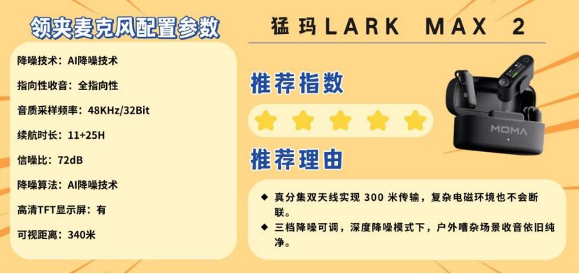 猛玛LARK MAX 2主打长续航与强性能,总续航达36小时,搭配充电仓可满足两天高强度拍摄,支持边充边用。搭载AI智能降噪系统,针对户外风噪、车流噪深度压制,收音纯净;支持一拖四多麦设计,适配多人团队拍摄,多声道清晰分离。300米超远距离传输稳定,延迟低至18ms,48kHz/24bit采样率搭配高保真咪头,人声还原度高。金属机身耐用,OLED显示屏实时显示参数,兼容相机、手机、调音台等,是团队创作的旗舰之选。
