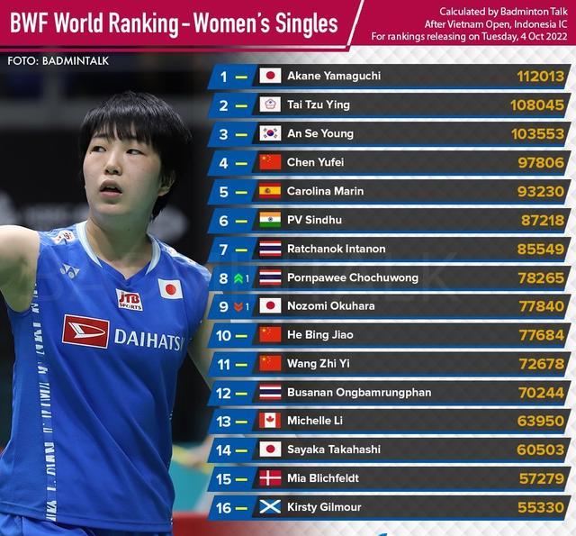top16中日本、国羽、泰国各占三席。相较上期,陈雨菲扣减4200分仍局第四,何冰娇、王祉怡积分未变,排名未改。马林昨日在加拿大公开赛super100半决赛21-9,19-21,15-21不敌中国台北选手宋硕芸,后者不敌东道主选手、最新一期世界排名第13的李文珊而摘银。