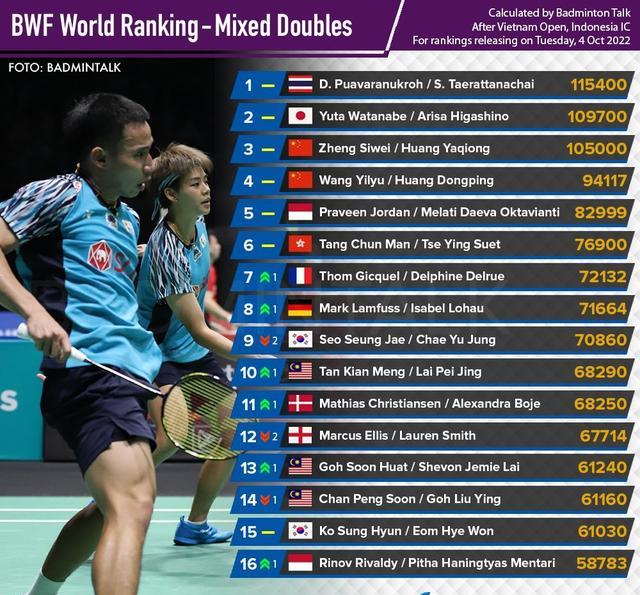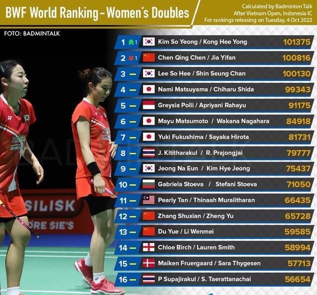top16中印尼占据五席,马来西亚三席次之。小林优吾/保木卓朗已经盘踞榜首三周了,上期升至第二的新科奥运冠军李洋/王齐麟掉至第二,积分扣减2450分;再度和教练闹出不和传闻的苏卡穆约在有关方调停下重归于好,小黄人扣减1200分同时重返第二。新科世锦赛冠军谢定锋/苏伟译超越决赛对手阿山/亨德拉,升至第四;不老组合扣减5000分降至第五。
