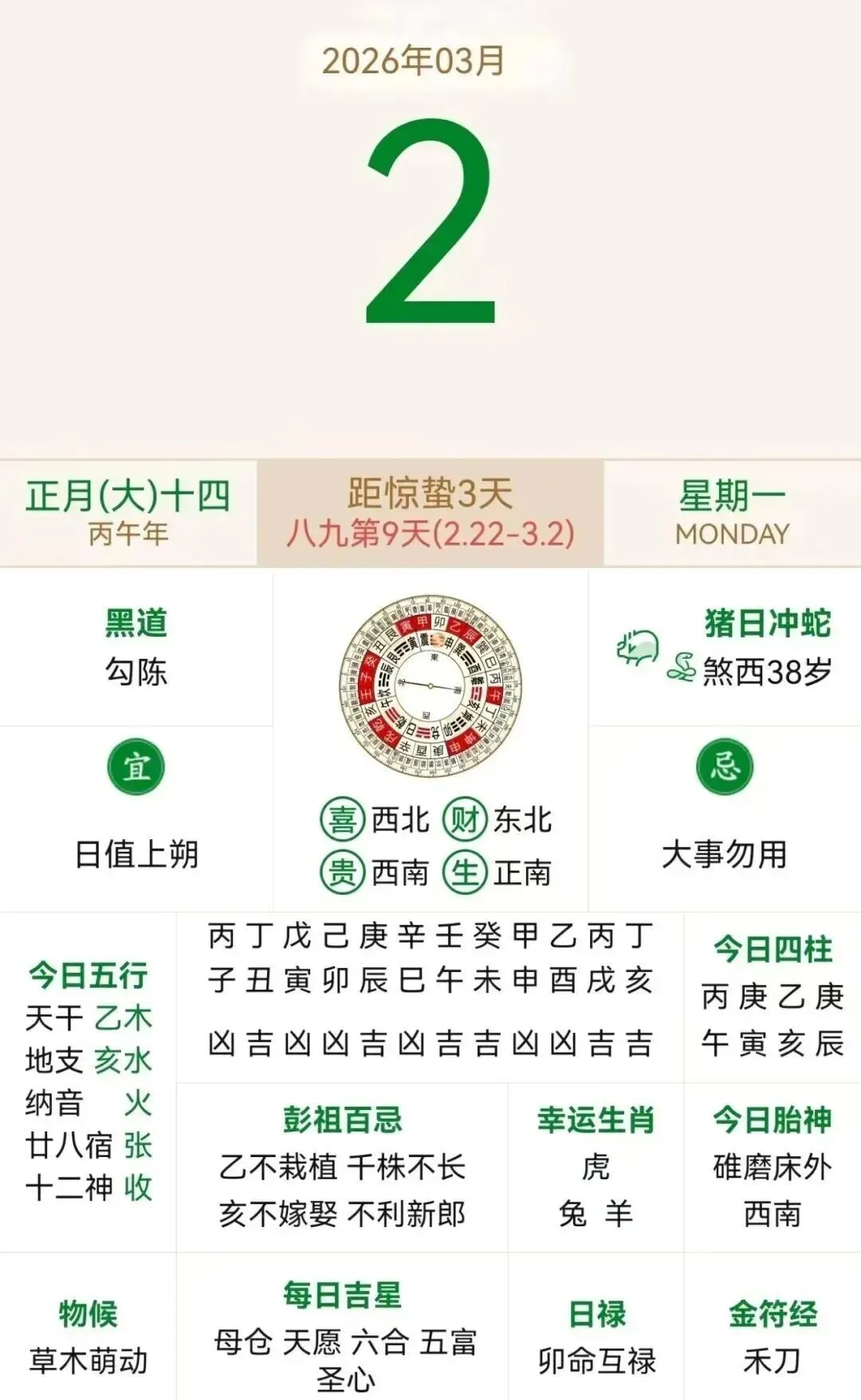 小运播报:2026年3月2日,星期一,农历正月十四(丙午年庚寅月乙亥日),法定工作日