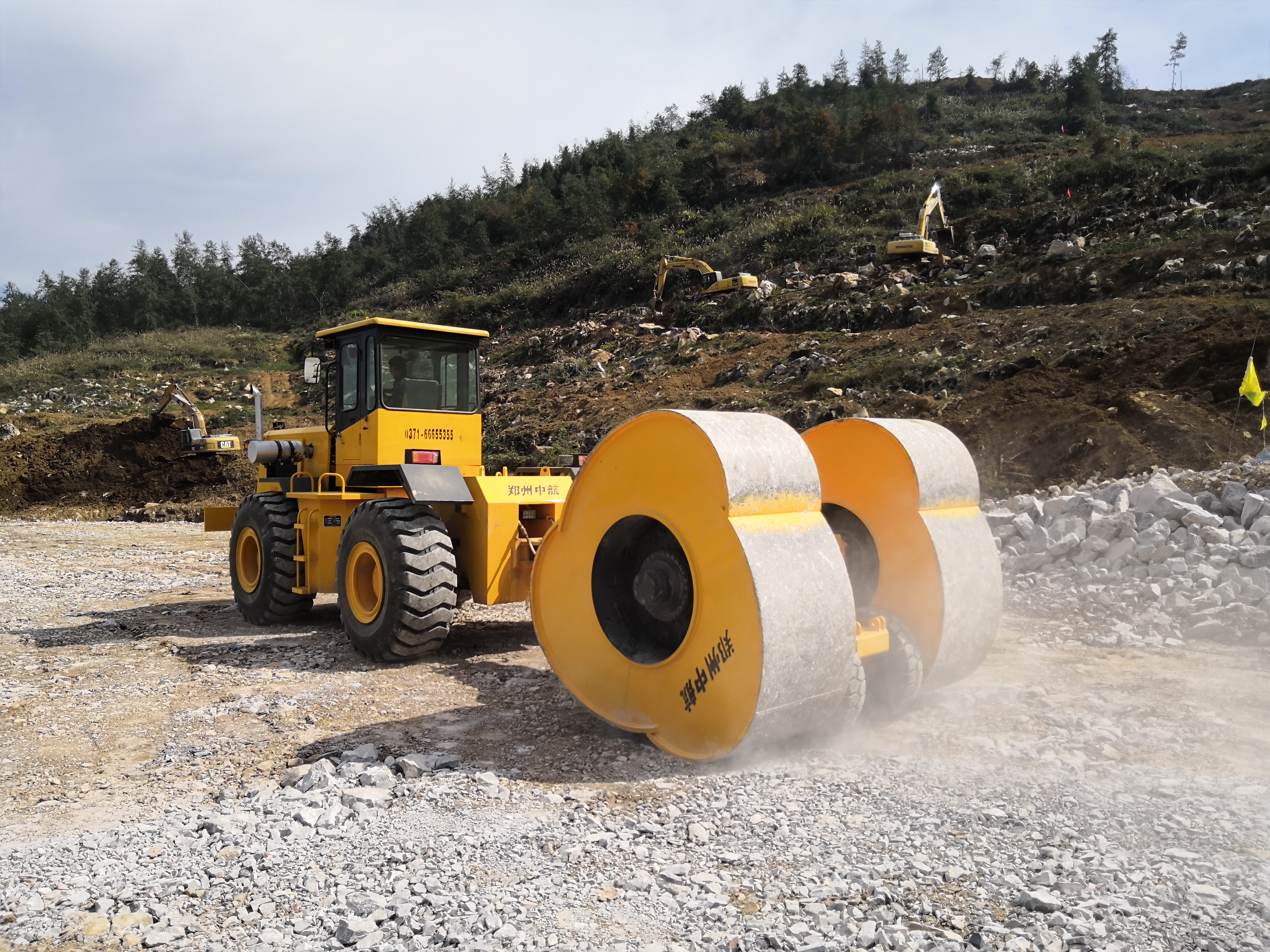 冲击碾压的工作原理就是yct25冲击压实机由牵引机带动非圆形论滚动将高位势能转化成动能对路基基底进行冲击从而对土体的深层产生较强的冲击能量,同时辅以滚压、揉压的综合作用,使土石颗粒之间发生位移、变形和剪切,随着土石密实度的增加,其影响深度也逐渐增加,从而使土体深层随着冲击波的传播得到压实。