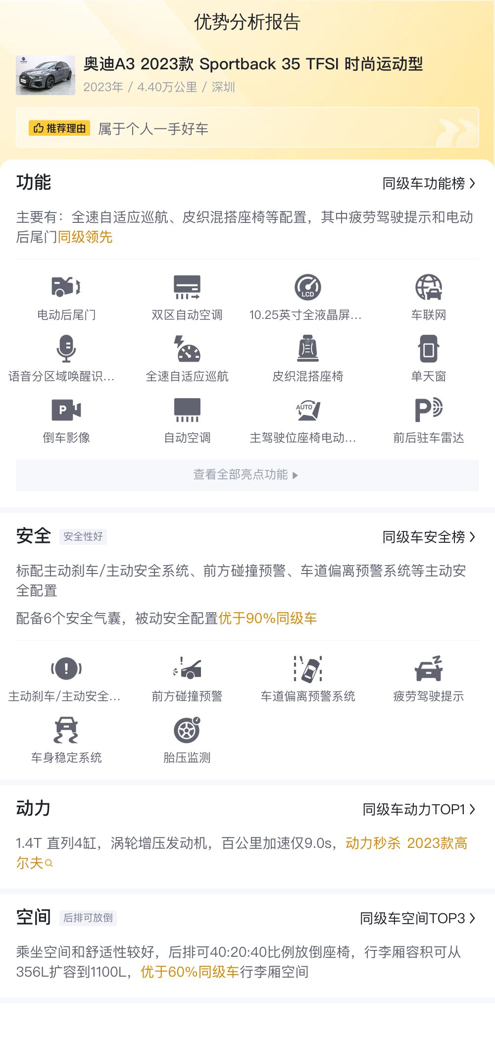 这辆奥迪A3 2023款 Sportback 35 TFSI 时尚运动型搭载1.4T直列4缸,涡轮增压发动机,百公里加速仅9.0s,动力秒杀2023款高尔夫等竞品车型。同时百公里油耗为6.54L(WLTC标准),优于40%同级车。