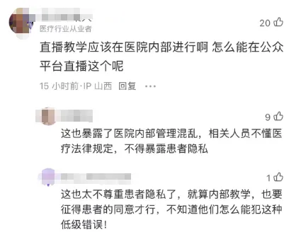 更多网友在此事发表自己的相关隐私未被合理保护的事件,百姓对医护人员的信任逐渐坍塌。“我的隐私会不会被泄露?”“医院是否真的在乎我的权益?”这些疑问会在无数患者心中滋生。一场直播,伤害的不仅是当事人,更是整个医疗行业的公信力。