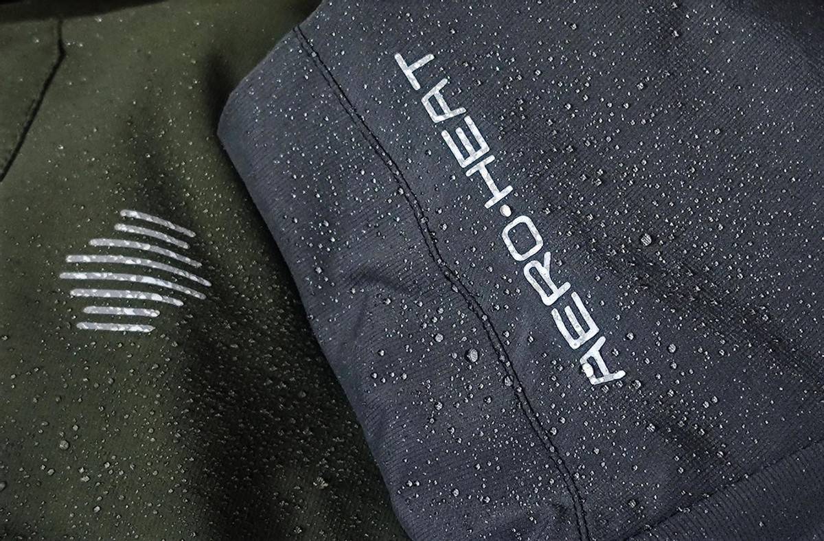 左肩顶部靠前的位置设计了处荧光反光标,AERO-HEAT动态保温的英文提示,荧光反光,暗环境只要略有光线就会发出较为明显的反光,显著提高晚上、阴天等暗环境的安全性,也展现单导动态图保暖的品牌特色。