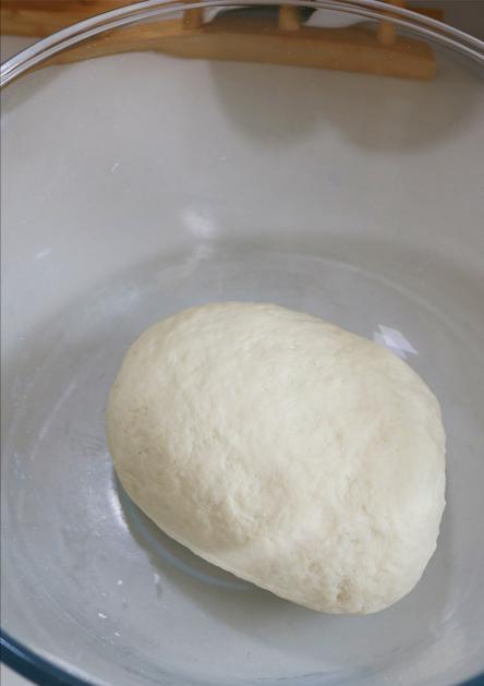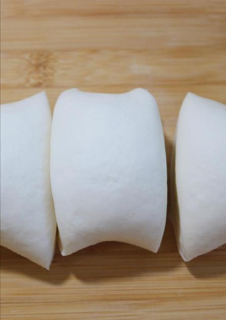 醒发面团分九份,取其一擀薄饼,一侧涂油,从另一侧卷起成紧致筒状。