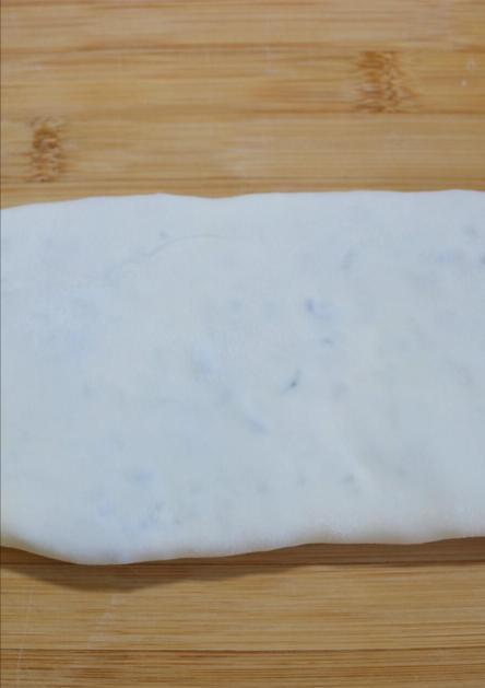 在另一空白处取小块油塑形为麦穗,将筒状面团置于麦穗中心,沿圆周缓缓卷起并捏紧成饼,最后擀制成厚薄均匀的圆形面饼。