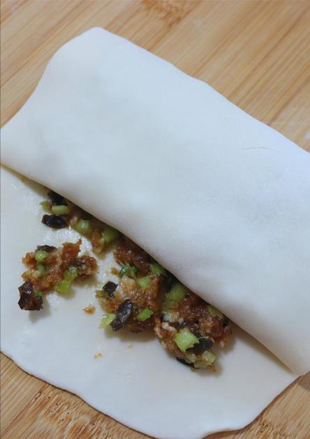 取出首份醒好的面团,分小块与面皮等大等量,擀开后按包猪肉馅方式包裹,制好馅饼置于蒸锅,大火蒸制25分钟。