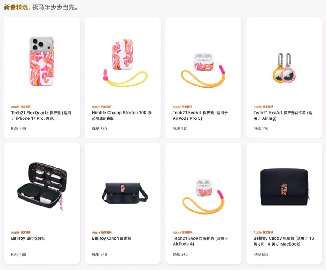 此外推出了5款马年限定配件,包括iPhone 17系列/AirPods Pro 3/AirPods 4/AirTag的保护壳以及一款新春版移动电源,均饰有马年限定图案,售价在198元至549元区间。
