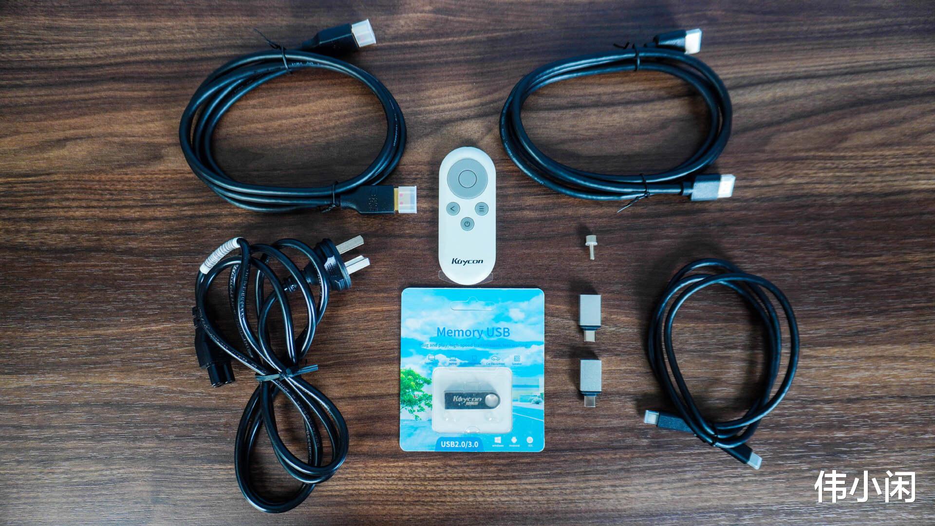 毕竟定位与价位在这摆着,配件自然相对齐全,配置有DP线1.8米、HDMI线1.5米、USB-C线1米、电源线1.5米、USB-C OTG转接头、文件U盘。
