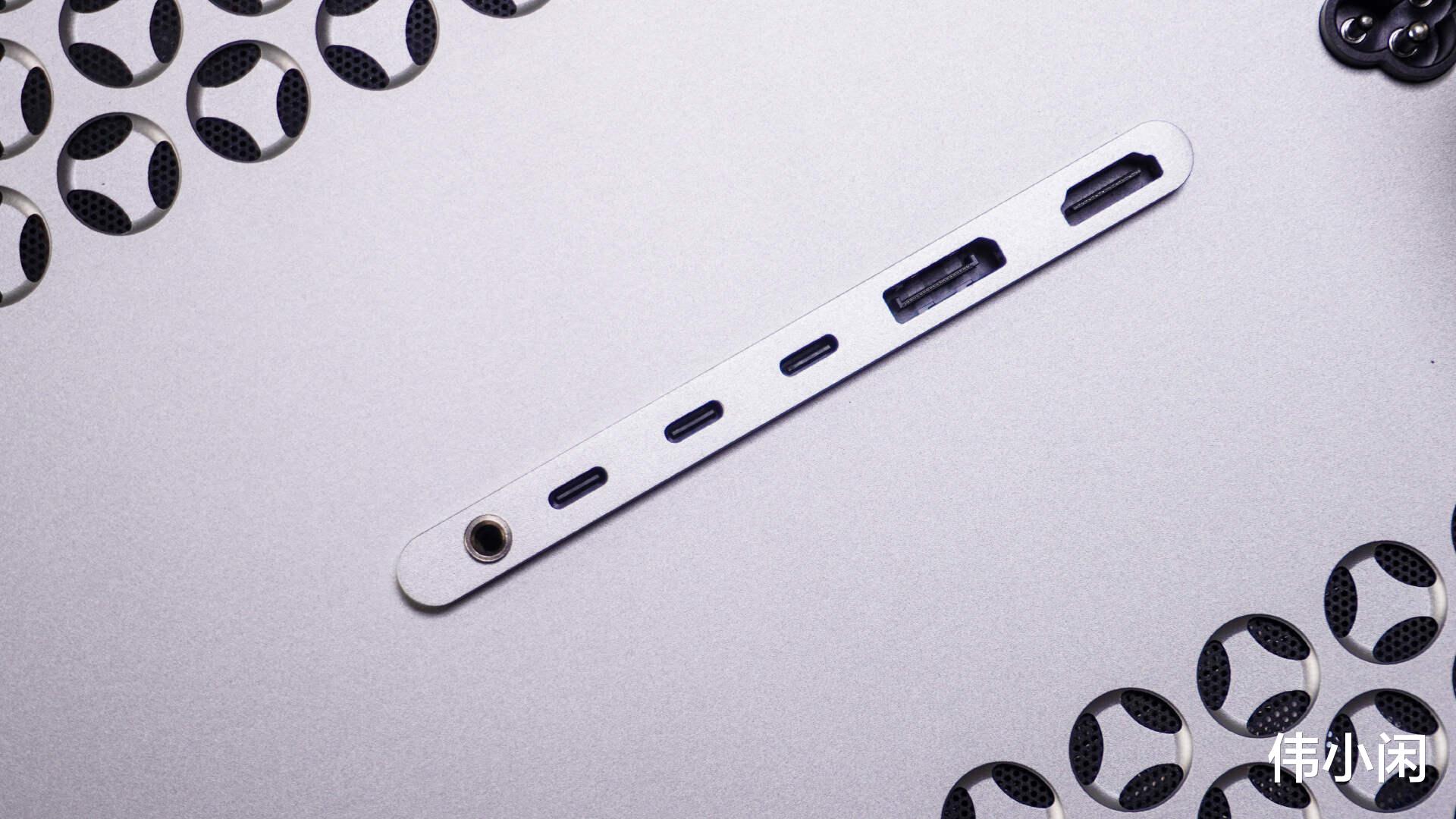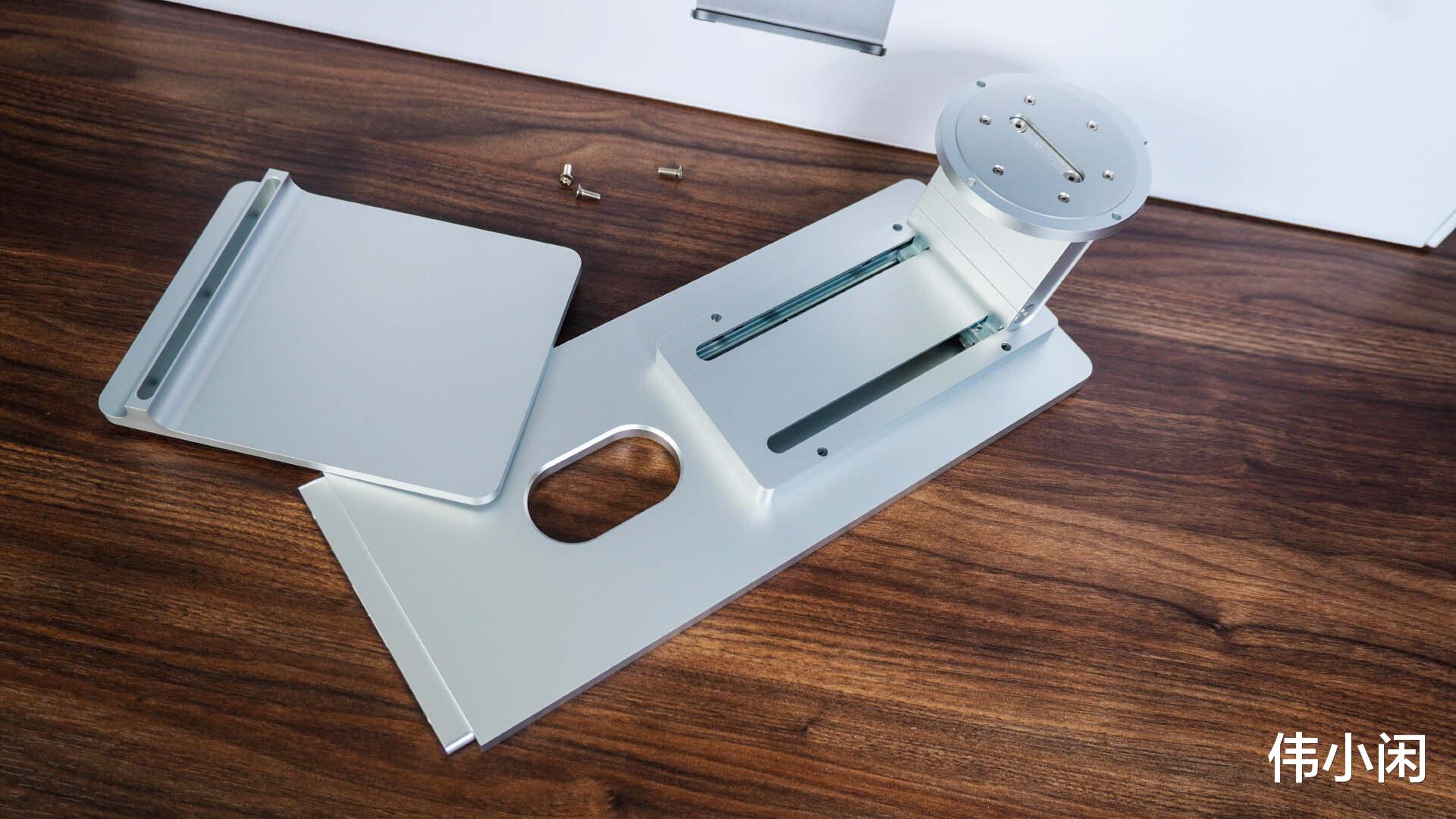 这是可升降旋转支架,具备旋转、升降、俯仰功能,材质与显示器背壳相同,整体感非常好。
