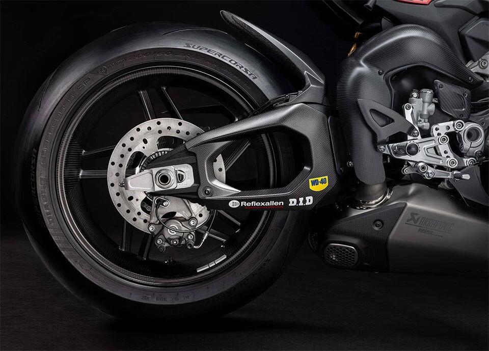 这车的厉害之处在于,很多配置你在普通版上花钱也买不到。最硬核的是刹车系统,它用上了Brembo为赛道研发的GP4 Sport Production卡钳和带散热鳍片的T-Drive刹车盘。简单说这就是把MotoGP和WSBK(世界超级摩托车锦标赛)级别的刹车直接给你了,为了就是让你在赛道上重刹入弯时,信心能多几分。