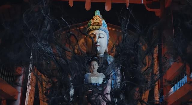 女主在佛像前被黑气缠绕,阴郁的气氛,配上哗啦啦的风声,满满的中式恐怖风。