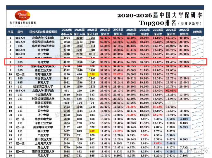 这所让人直呼“看不懂”且表现亮眼的百年名校,正是南开大学。当我们复盘近期出炉的南开大学2026届保研数据时,最先跳进眼帘的是一个极具张力的数字:39.2%。2020-2026年的整体保研率不仅在全国高校中位列第七,更是直接超过了北京师范大学、西北工业大学等985名校。