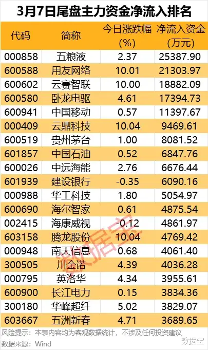 五粮液、用友网络、云赛智联、卧龙电驱、中国移动尾盘主力资金净流入金额超1亿元;云鼎科技、贵州茅台、中国石油、中远海能、建设银行净流入金额也居前。