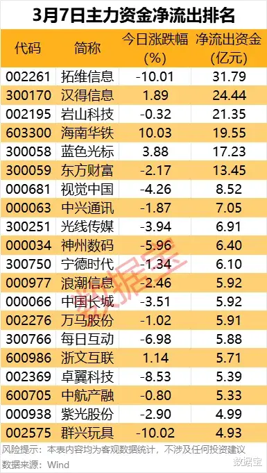 据数据宝统计,拓维信息、汉得信息、岩山科技遭主力资金大幅出逃,分别净流出31.79亿元、24.44亿元、21.35亿元;海南华铁、蓝色光标、东方财富等净流出金额均超10亿元。