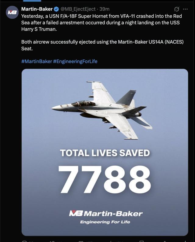 这家公司有一个习惯,但凡“马丁-贝克”公司的客户,只要某某战机出问题了,别管是在训练过程中,还是战场上,一旦弹射座椅“拯救了”该战机驾驶员,他们就会将这起事件“编号”,并记录详细内容,发布在公司官网上,彰显“马丁-贝克”公司出品的弹射座椅,绝对是全球所有战机驾驶员的“保命符”。
