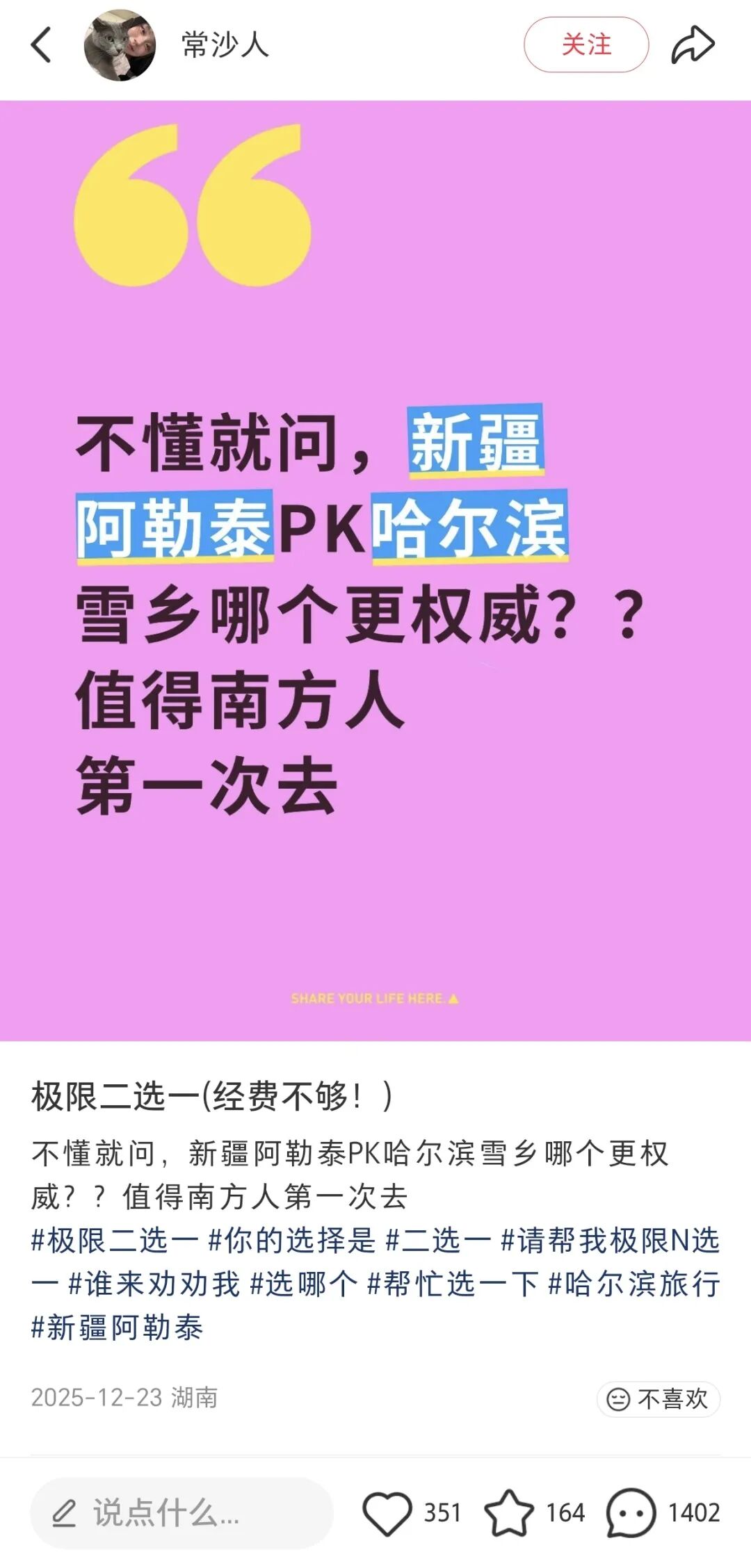 一位旅游博主这样总结:“如果你想让朋友圈惊艳,去哈尔滨;如果你想让自己的人生清单圆满,来阿勒泰。”