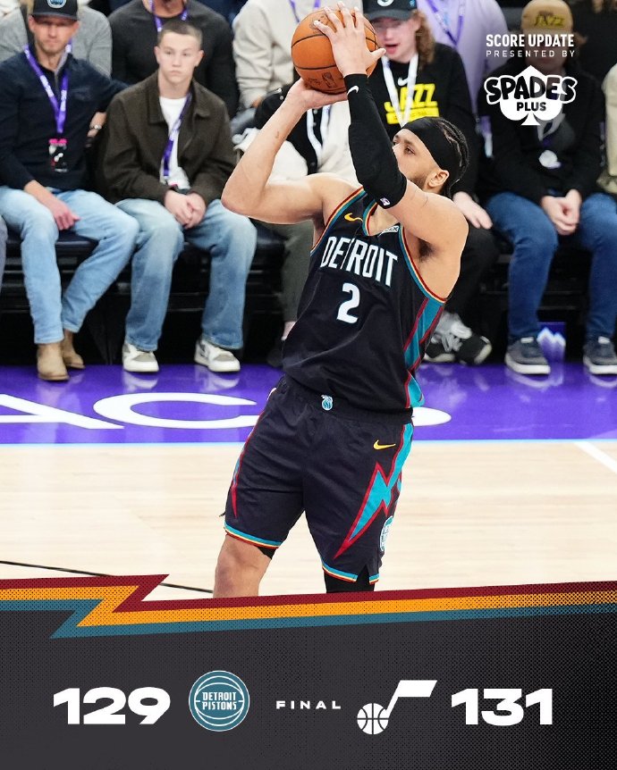 凭借乔治的抛投准绝杀,爵士今天在主场以131-129,险胜东部第一活塞,终结了4连败,也终结了活塞的3连胜。爵士战绩来到11胜19负,继续排在西部第十二。活塞战绩24胜7负,依旧高居东部第一。