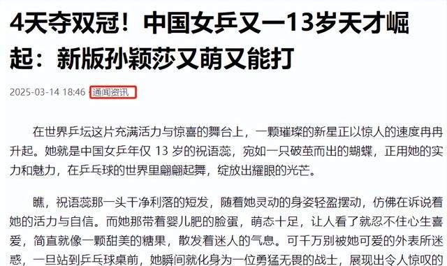 信源:2025年3月14日关于“4天夺双冠!中国女乒又一13岁天才崛起:新版孙颖莎又萌又能打”的报道
