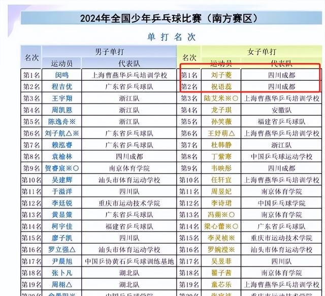 2024年全国少年乒乓球比赛南方赛区,刘子菱获得第一名,祝雨蕊憾负为第二名。