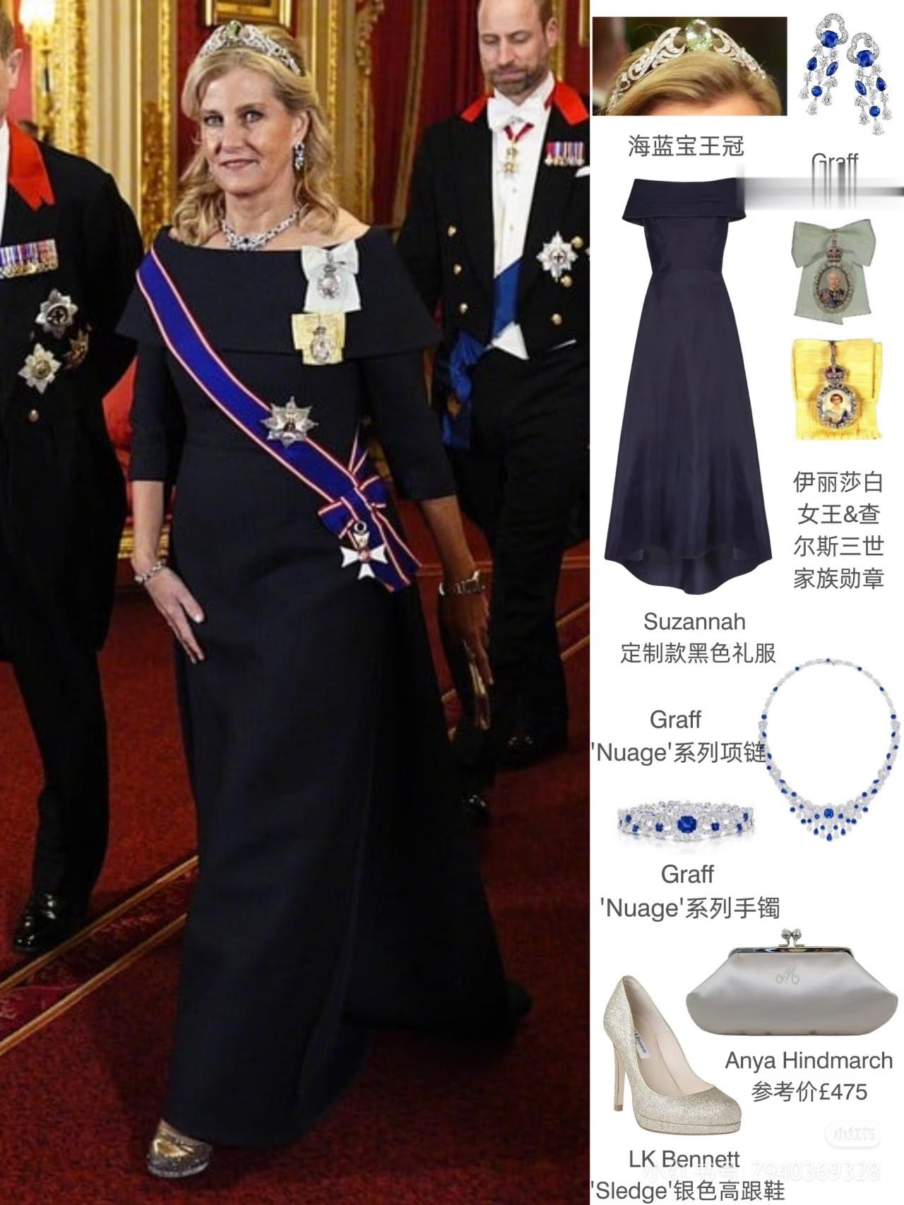 苏菲王妃身穿一袭Suzannah黑色定制款礼服,王冠依旧是海蓝宝,不过搭配了爱德华给买的Graff 蓝宝石套装,整体效果很不错。