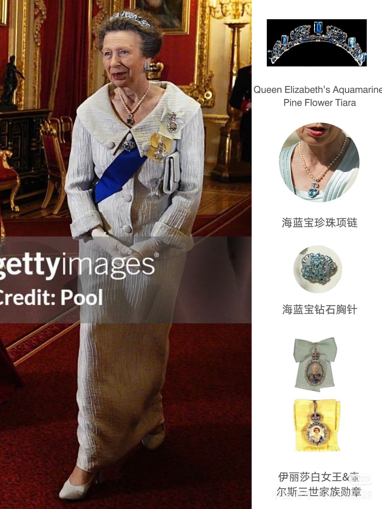安妮长公主则是身穿白色礼服,搭配了海蓝宝Tiara、珍珠项链和胸针,看上去气质优雅又大气。