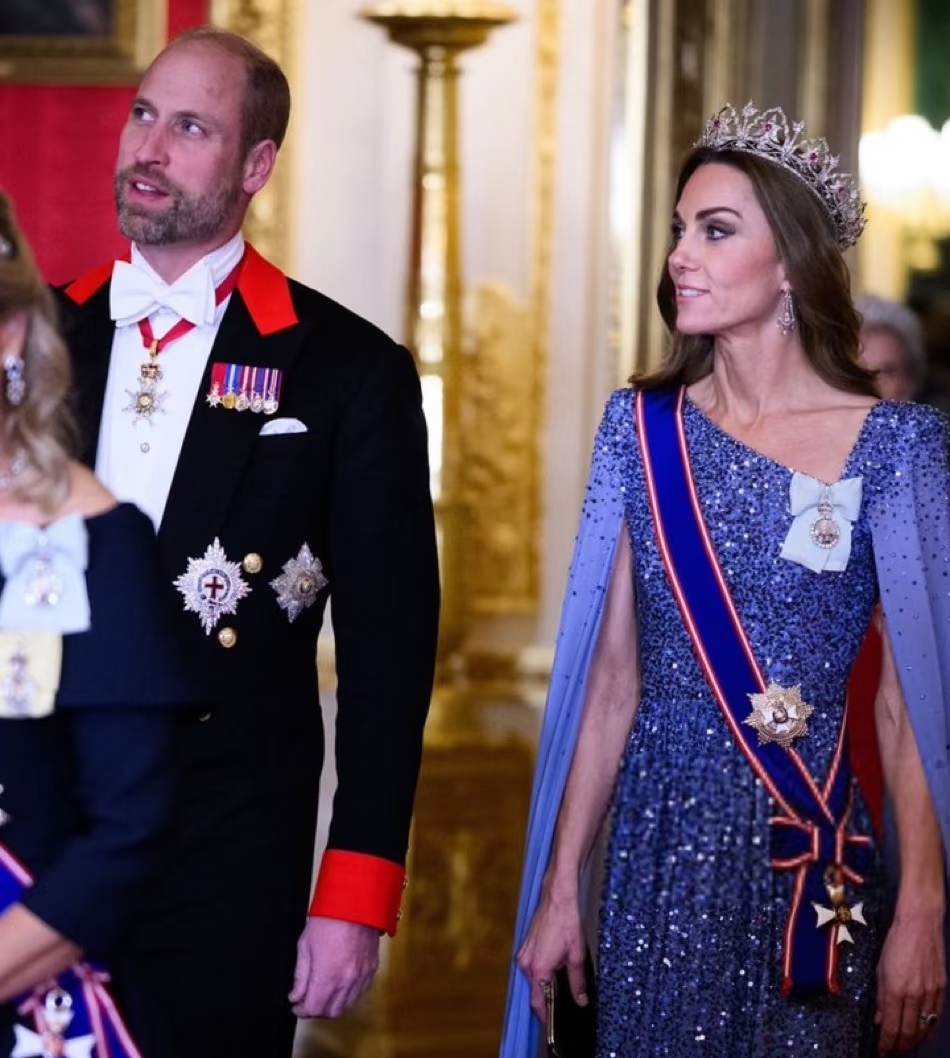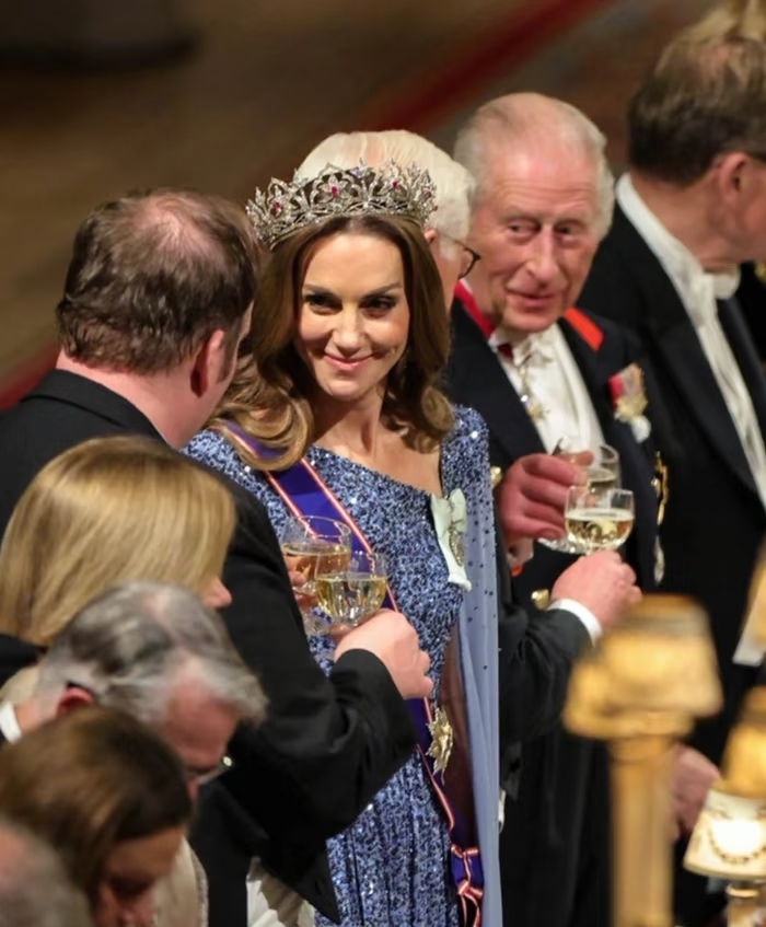 当然,给大家带来最大惊喜的还是凯特王妃,一袭爱牌Jenny Packham蓝色水晶亮片披风礼服,搭配新解锁的维多利亚女王东方王冠,整个人都在闪闪发光。