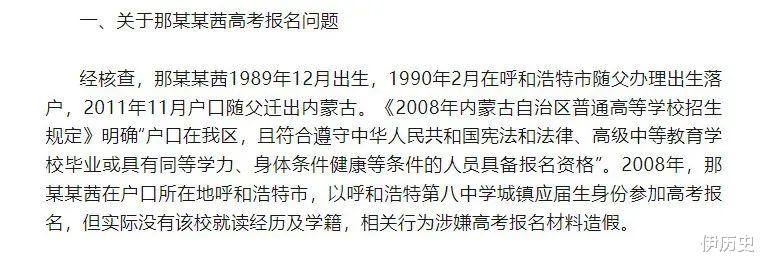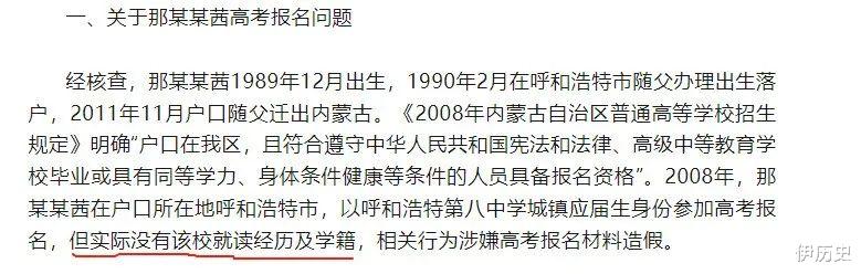 “2008年,那某某茜在户口所在地呼和浩特市,以呼和浩特第八中学城镇应届生身份参加高考报名,但实际没有该校就读经历及学籍,相关行为涉嫌高考报名材料造假。”看明白了吗?白纸黑字,官方认证,直接给你锤死了——高考报名材料造假。