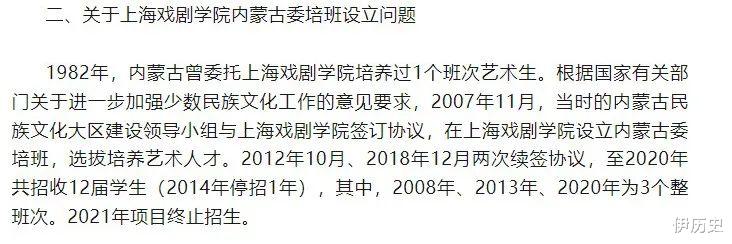 “1982年,内蒙古曾委托上海戏剧学院培养过1个班次艺术生……2007年11月,当时的内蒙古民族文化大区建设领导小组与上海戏剧学院签订协议,在上海戏剧学院设立内蒙古委培班……至2020年共招收12届学生……”
