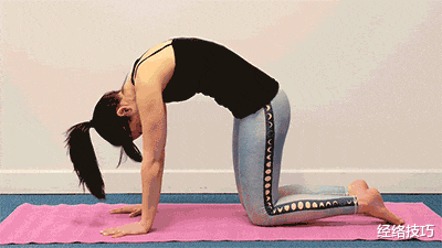 这个动作模仿猫咪伸懒腰。呈四足跪的姿势,吸气的时候抬头、腰部自然往下塌,呼气的时候拱起背部、低头看肚脐。慢慢地重复5次,大概1分钟。