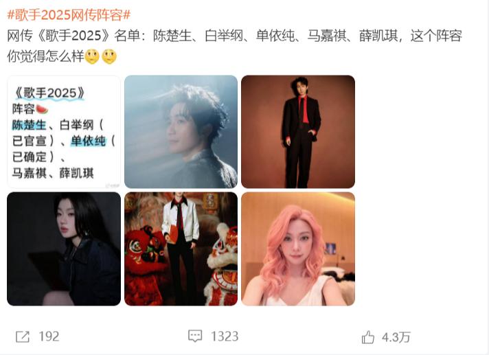 看到“歌手2025网传阵容”话题登上热搜后,网友们立即点进去,从娱乐账号爆料上看,网传的《歌手2025》录制名单是:陈楚生、白举纲、单依纯、马嘉祺、薛凯琪,看到这样的名单,许多网友都忍不住问:这确定是认真的吗?