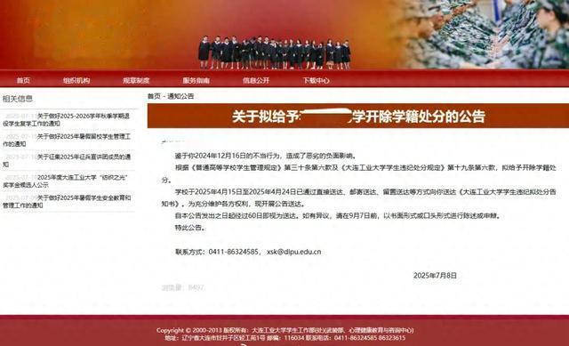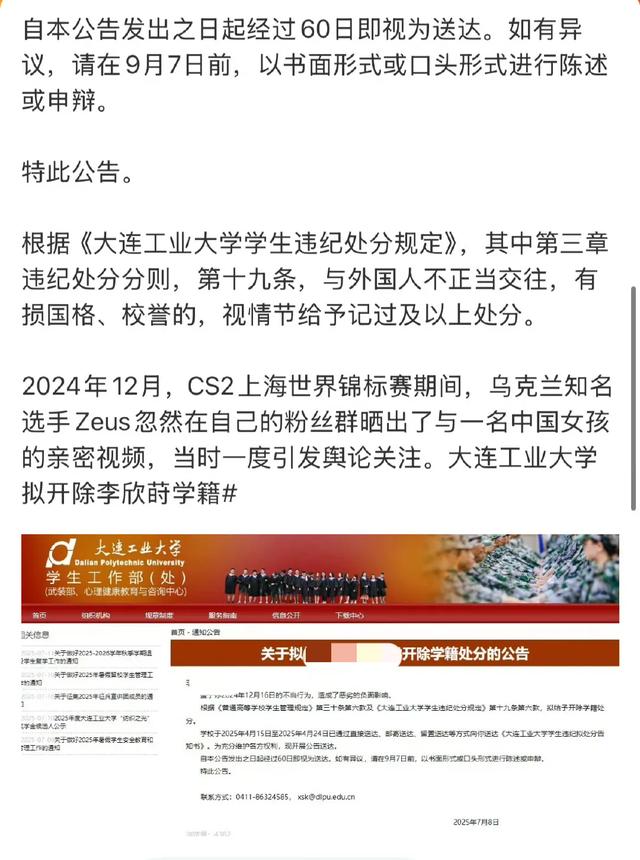 学校做出该处罚,根据的是《大连工业大学学生违纪处分规定》第19条第6款“与外国人不正当交往,有损国格、校誉”,给予记过以上处分。