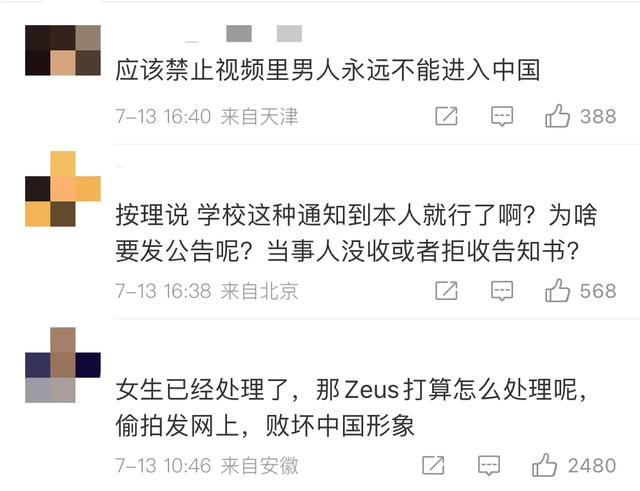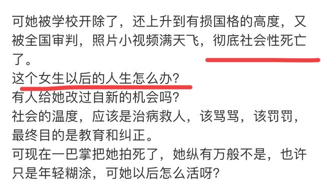 这部分人的统一观点,认为该女生的行为,引发了后续无法掌控的结果,在国际上危害了学校以及国家形象,非常不自爱。
