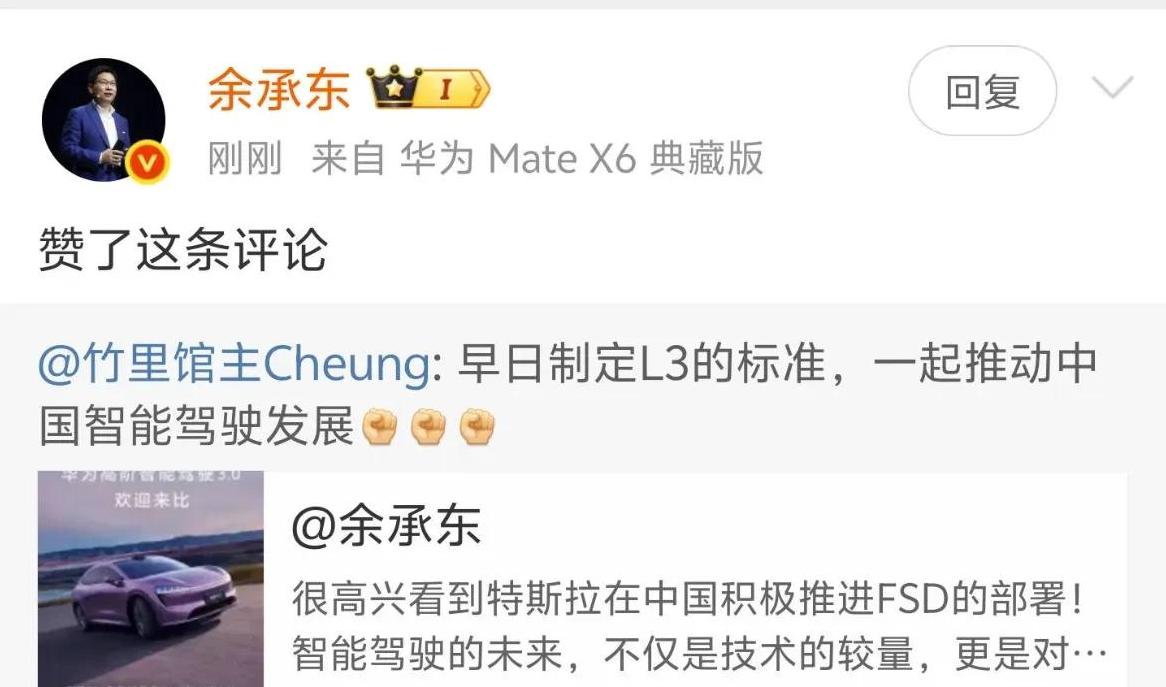 在特斯拉宣布这一消息后,余承东便在微博上转发并评论了此事,还特别提到:“终于等来了这一天!”