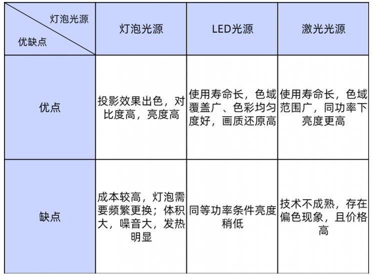 02 光源选择:LED、ALPD激光还是三色激光?投影光源经历了从传统灯泡到LED再到激光的发展历程。每种技术都有其特点。