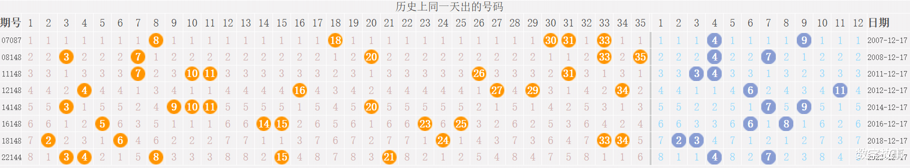 【其他历史数据查询统计】大乐透历史上的今天2025-12-16 星期二 大乐透不开奖每年12月16日出号情况: