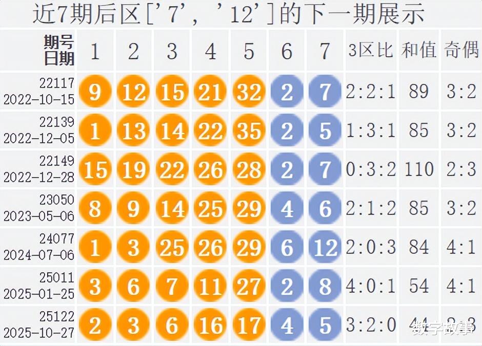 => 汇总的后区冷热号:热号:2,5,7,4冷号:12,6,3,1