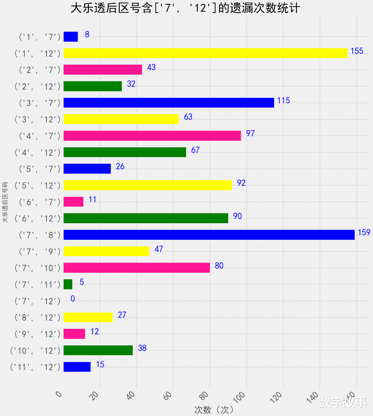 如图所示, 遗漏次数较多的双号组合如下:3-7: 115期1-12: 155期7-8: 159期