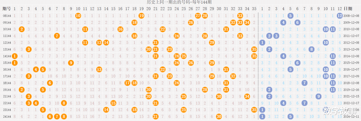 博弈心理,挑战概率: 看近期开奖号码,也可看历史数据统计!【大乐透25144期多角度冷热号】大乐透25144期四维走势图,前后区号统计及冷热号1) 历史同一天:12月17日 (共8期)