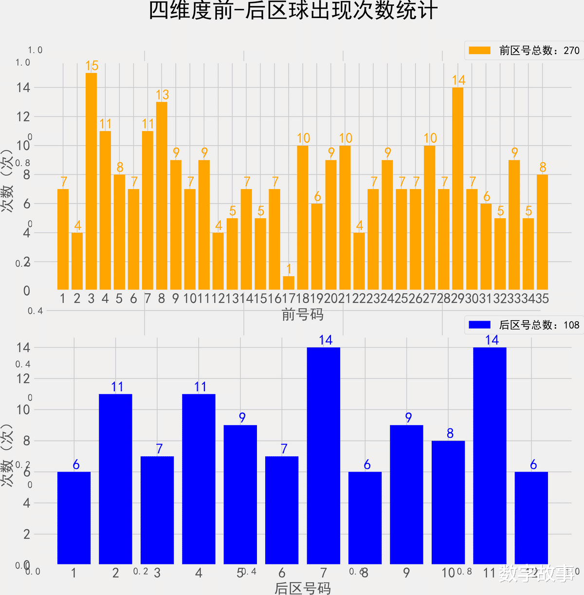 => 统计出现概率综合以上4个纬度的号码,共54期根据出现次数,分为热号,冷号,其他的为温号。统计样本数据: 270个前区号码 108个后区号码