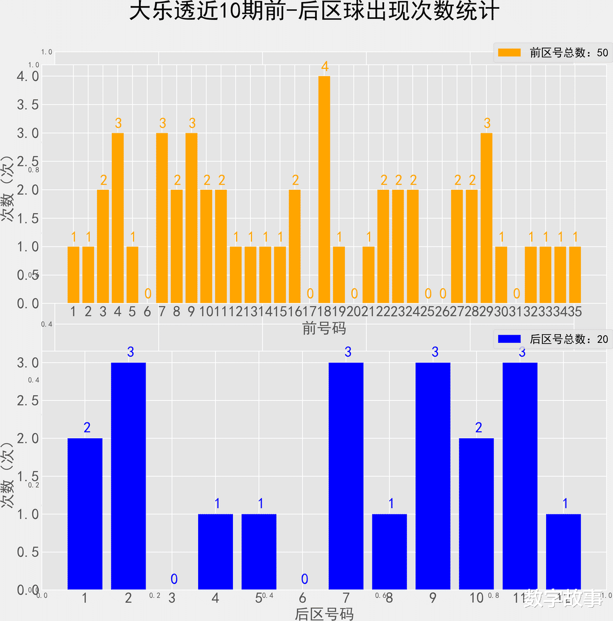 大乐透近10期前后区号统计情况统计样本数据: 50个前区号码 20个后区号码