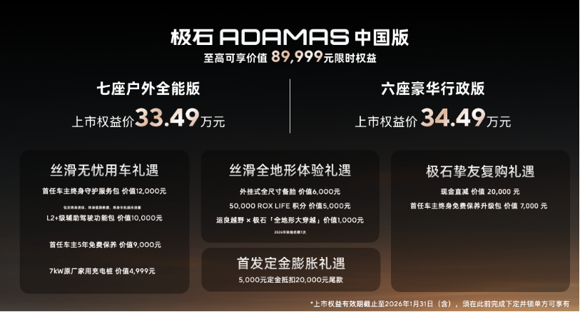 12月28日,极石ADAMAS上市。新车共推出2款车型,售价34.99-35.99万元,权益价33.49万-34.49万元。