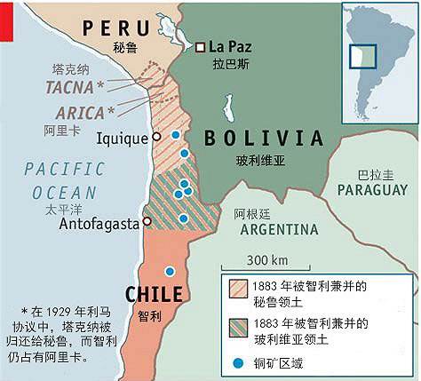 其实秘鲁反对不是因为想和智利做邻国,只是因为阿里卡地区原本是秘鲁领土,涉及一个条约。1879年南美太平洋战争时期,玻利维亚失去了沿海国土,秘鲁也失去了塔克纳、阿里卡、塔拉帕卡三个省。不过根据条约,只有南部的塔拉帕卡是割让给智利,塔克纳和阿里卡没有割让,智利只有十年管辖权,到期后必须归还秘鲁。