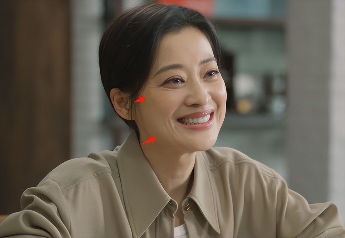 镜头前一秒对着梅婷,鱼尾纹和法令纹清晰可见,厚重的眼袋更是拉高了年龄感。