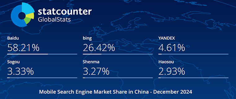 2024年12月中国搜索引擎市场份额报告(手机端):百度:58.21%,必应:26.42%,YANDEX:4.61%,搜狗:3.33%,神马:3.27%,Haosou:2.93%Mobile Search Engine Market Share in China - December 2024Baidu:58.21%,Bing:26.42%,YANDEX:4.61%,Sogou:3.33%,Shenma:3.27%,Haosou:2.93%