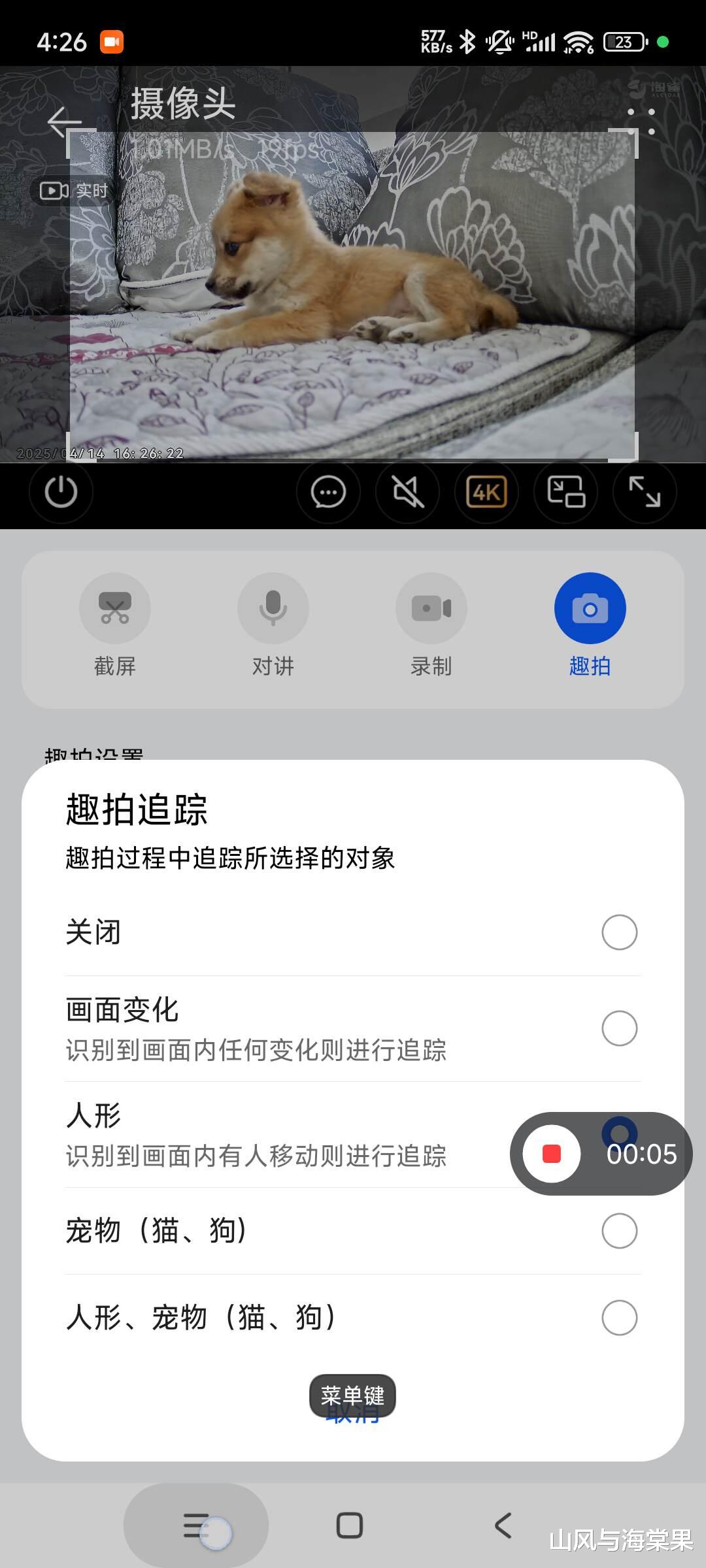 摄像头内置语音小助手功能,说出“海雀海雀”便可以进行语音控制,可以让他转动过来,或者拍照录像等。另外语音功能也进一步拓展了使用场景,摄像头自带一些语音提示,还可以自己录制更多,可实现不同提醒功能,比如提醒家人按时吃饭,警告闯入者,以及呵斥动物停止不好的行为等。宠物听到主人声音后,会主动走到镜头前打量,爪部轻拍镜头的模样通过 4K 画质纤毫毕现,解锁了全新的人宠互动方式。