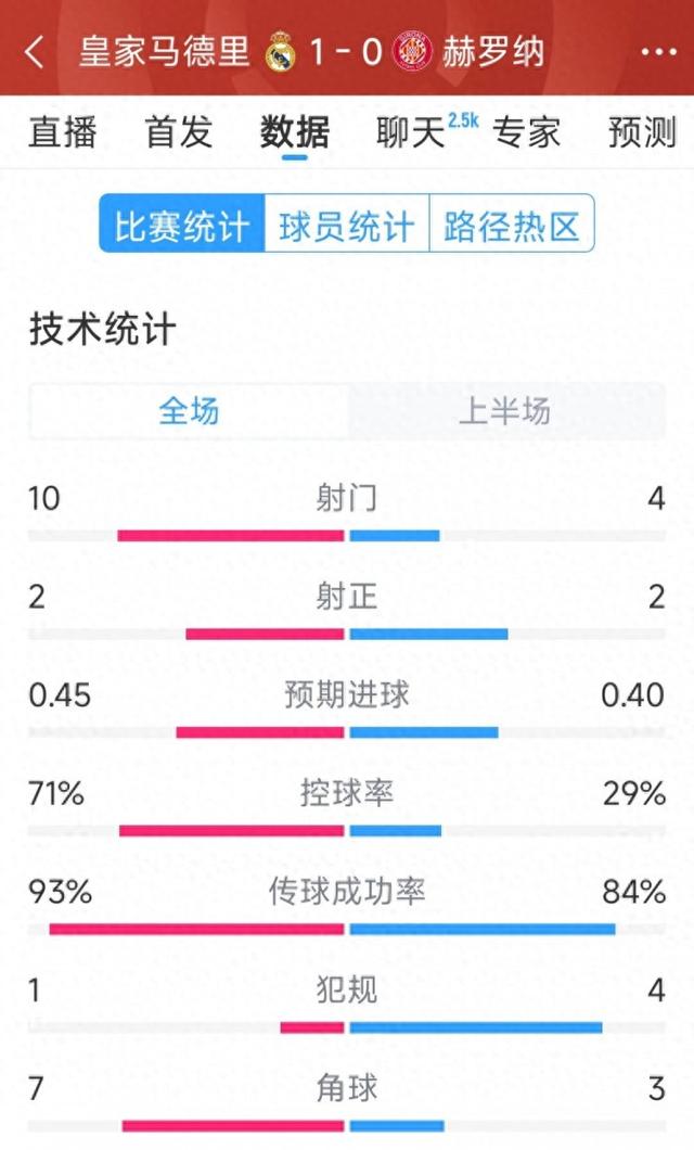 直播吧2月24日讯 本轮西甲皇马对阵赫罗纳半场结束,皇马凭借莫德里奇远射1-0领先。以下为双方半场数据对比: